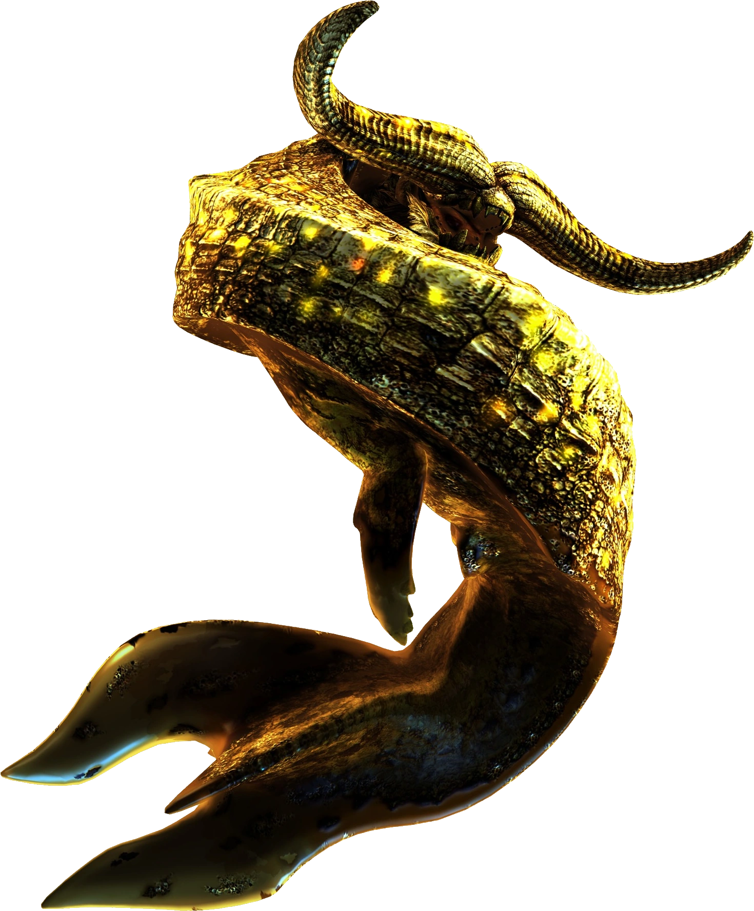 Goldbeard is thought to simply be an elder Ceadeus. Its body is now a mixture of black scales and shining golden scales and fur, and its horns are larger. Goldbeard is more aggressive than normal, and more adept at using its water blast.