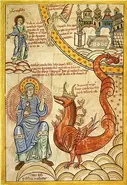 The Red Dragon, which has been described as aquatic, as well as the Beast from the Sea that accompanies it in Revelation bears some similarities with the Leviathan from the Old Testament. According to one interpretation, this is shown when comparing Issiah 27:1 and Revelation 12:3 and 13:14: both texts symbolize the struggle of the Israelites to overcome their challenges which is represented as a woman in labor. In Issiah, the Biblical God slays the Leviathan in response to their qualms while in Revelation, God protects the women the Red Dragon seeks to devour, both texts involving the use of a sword by a heavenly figure to defeat their respective dragon foe. Although in neither case are the Israelite's challenges fully solved, God's victory over their enemies as well as giving protection (as in the latter case) gives hope to the Israelites. Thus, John, the writer of Revelation, is emphasizing that God is the source of salvation by invoking certain motifs from Issiah 27:1 and manifesting them in Revelation.[2]