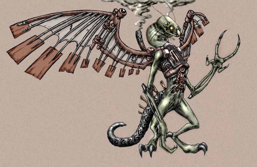 The Jabberwock is a fictional monster from the novel Through the Looking-Glass, and What Alice Found There both by Lewis Carroll. It only appears within the poem, Jabberwocky that Alice reads during the first chapter and never interacts with the rest of the cast. In Tenniel's illustration, the Jabberwock is a large winged chimera with the body of a dragon, a whiskered, fish-like head, insectile antennae and a pair of talon-like hands on both its arms and its wings, which may also serve as forelegs when it walked on the ground. It presumably lived within a dark forest until it was slain by an unnamed hero wielding a vorpal blade. {C Apparently a ferocious maneater in life, Jabberwocky warns the unnamed hero to beware "The jaws that bite" and "the claws that catch,"