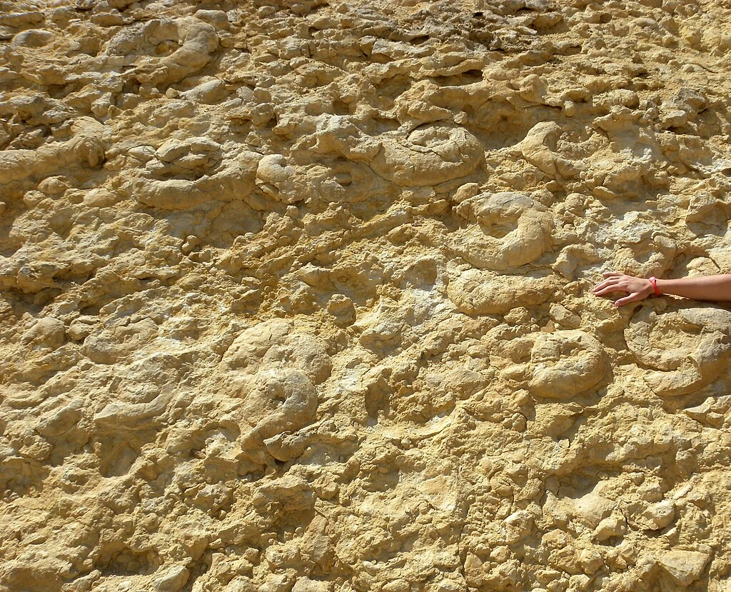 A photograph of a collection of clearly visible ammonite fossils on the surface of the Maktesh Ramon. The area would've been one frequently crossed for trade and could've been the inspiration for various myths.